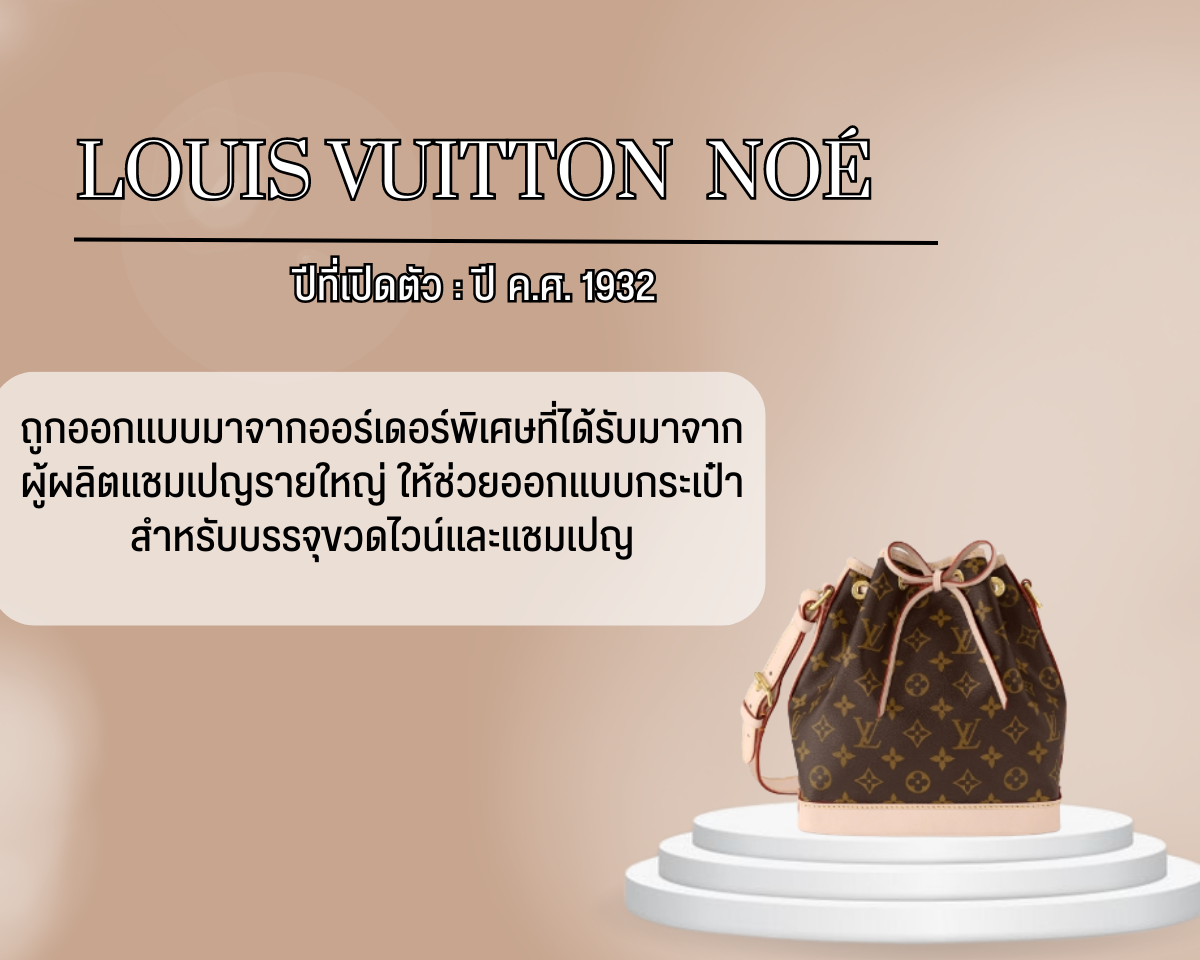 กระเป๋าทรงบักเก็ตรุ่นนี้พาย้อนกลับไปสู่ดีไซน์ในปี 1932 ซึ่ง Gaston-Louis Vuitton พัฒนากระเป๋าที่แข็งแรงและมีสไตล์ตามความต้องการของผู้ผลิตแชมเปญ โดยออกแบบกระเป๋าให้มีน้ำหนักเบา ทนทาน มีความหรูหรา และมีพื้นที่มากพอให้บรรจุขวดแชมเปญได้ 5 ขวดขึ้นไป จนได้เป็นผลงานรุ่น “Noé” ปัจจุบันกระเป๋ารุ่นนี้ผลิตด้วยวัสดุและขนาดที่หลากหลายมากขึ้น แต่ยังคงรักษาเอกลักษณ์เด่นแบบดั้งเดิมไว้อย่างครบถ้วนไม่ว่าจะเป็นรูปทรงเฉพาะตัว พื้นที่กว้างขวาง สายรูดปิดกระเป๋า และมีการปรับแต่งให้เข้ากับไลฟ์สไตล์ในยุคนี้มากขึ้น พร้อมด้วยสายหนังที่สามารถปรับความยาวได้ จึงช่วยให้สะพายไหล่หรือสะพายเฉียงได้สะดวก