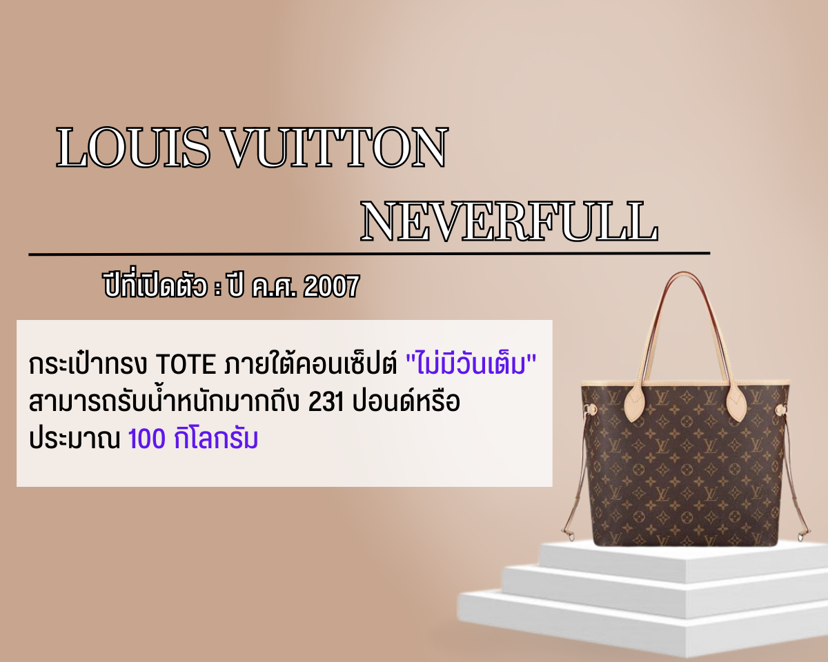 อีกหนึ่งรุ่นคลาสสิกที่ขึ้นแท่นกระเป๋าในตำนานของหลุยส์วิตตอง คือ “Neverfull” ต้นแบบกระเป๋าโท้ตที่ใครๆ ก็รู้จัก เปิดตัวครั้งแรกในปี 2007 และตลอดหลายปีที่ผ่านมาได้กลายเป็นหนึ่งในกระเป๋าหลุยส์วิตตองที่ประสบความสำเร็จมากที่สุด โดยลวดลายของรุ่นนี้มีทั้ง Monogram, Damier, Epi Leather และยังมีรุ่น Limited Edition ซึ่งสาเหตุที่ทำให้ Neverfull เป็นที่นิยมทั่วโลกมาอย่างยาวนาน ไม่เพียงเพราะดีไซน์เหนือกาลเวลาที่เป็นเอกลักษณ์เท่านั้น แต่ด้วยขนาดกระเป๋าที่ใหญ่และมีพื้นที่จุมากพร้อมให้ความรู้สึกทะมัดทะแมง จึงถือเป็นกระเป๋าที่ยอดเยี่ยมสำหรับใช้ในชีวิตประจำวัน