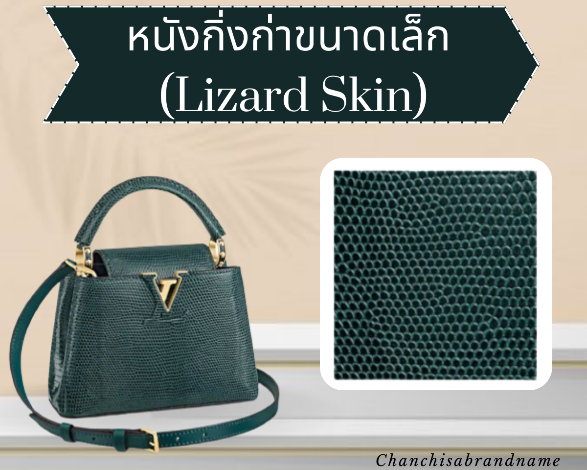ลักษณะของหนังกิ้งก่า หรือ Lizard จะมีความคล้ายกับหนังจระเข้ แต่พื้นผิวต่างกันเล็กน้อย ส่วนใหญ่จะนำหนังทั้งส่วนลำตัวและส่วนท้องมาทำกระเป๋า ส่วนของลวดลายจะเป็นเกล็ดขนาดเล็กถี่ มีความละเอียด ดูหรูหรา โดยทั่วไปหนังกิ้งก่าถือเป็นหนังสัตว์หายากอีกชนิดหนึ่ง เนื่องจากเป็นสัตว์ขนาดเล็ก วัสดุหนังจึงนิยมนำมาผลิตเป็นสินค้าขนาดเล็ก อีกทั้งคุณสมบัติที่ทนทานต่อการขีดข่วนได้เป็นอย่างดี แต่ควรหลีกเลี่ยงการสัมผัสกับน้ำโดยตรง เพราะอาจทำให้วัสดุหนังเป็นด่างดวงได้