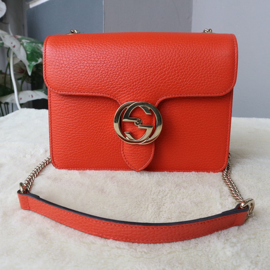 GUCCI Dollar Calfskin Small Interlocking G Shoulder Bagสวยมากก เรียกได้ว่า like new เลยค่าา มุมขอบดีค่า ตัวกระเป๋าสีส้มตัดกับอะไหล่เงินเข้ากันสุดๆอปก. เล่ม ถุงผ้า510304 213317